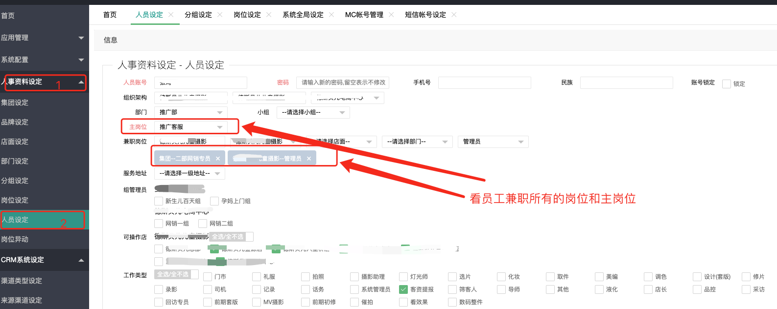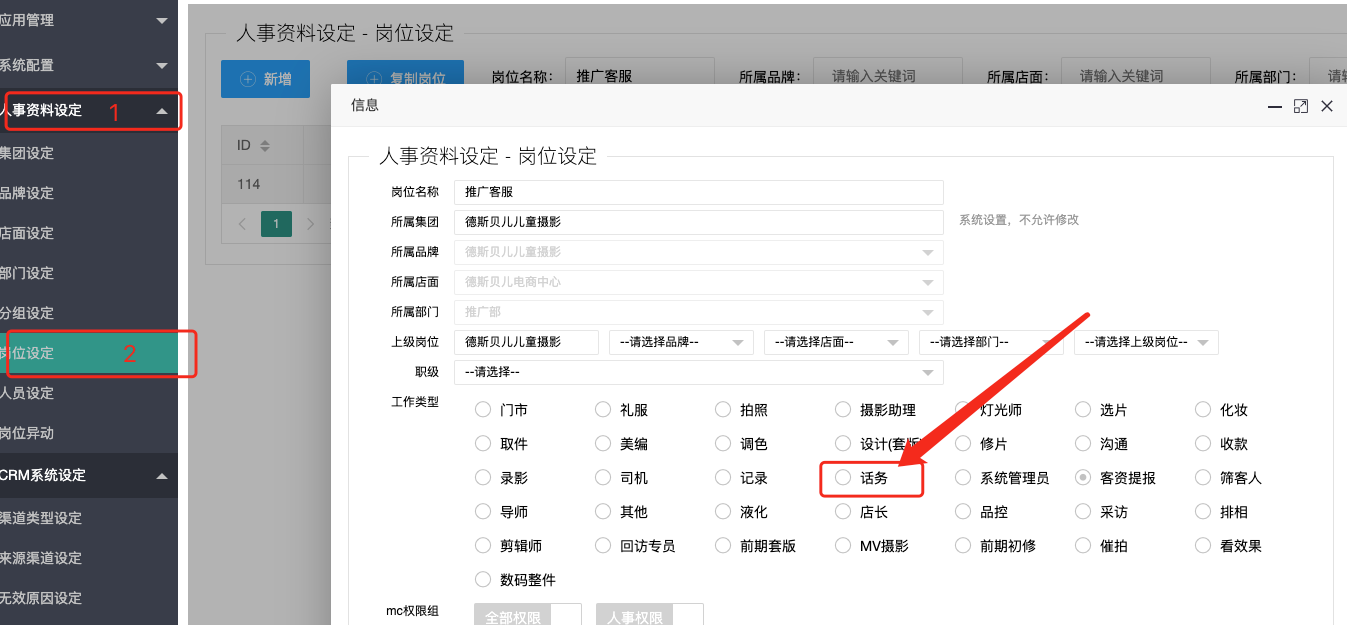 2、检查MC当前员工的所有岗位【含兼职】,点岗位编辑,查看岗位上有没有勾选话务工作类型