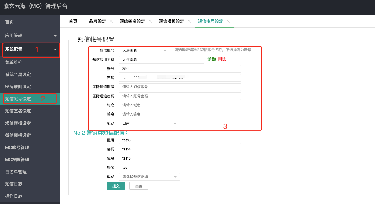 1.MC配置短信帐号: 如下图,在1→2→3位置添加短信帐号,短信帐号和春娜要。